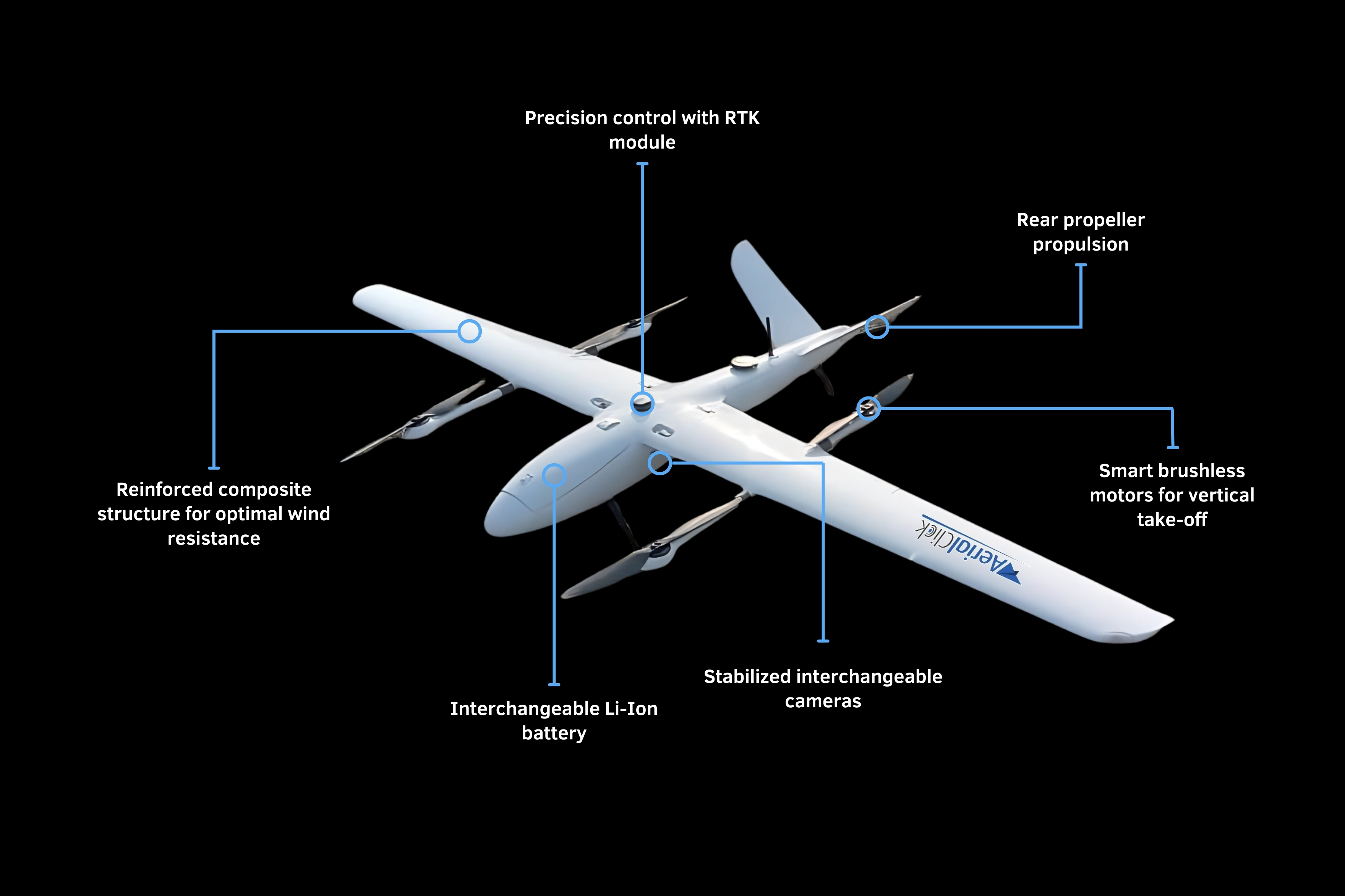 Grazie alla sua configurazione ibrida, integra le caratteristiche aerodinamiche di un'ala fissa per massimizzare l'efficienza in volo orizzontale e ridurre i consumi, con quelle di un multirotore per garantire decolli e atterraggi precisi anche in aree ristrette o prive di piste.